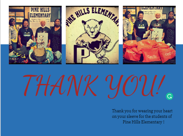 HAVE A GREAT YEAR PINE HILLS ELEMENTARY! THANK YOU PRINCIPAL SMOTHERS FOR ALLOWING US TO GIVE TO YOUR STUDENTS!!